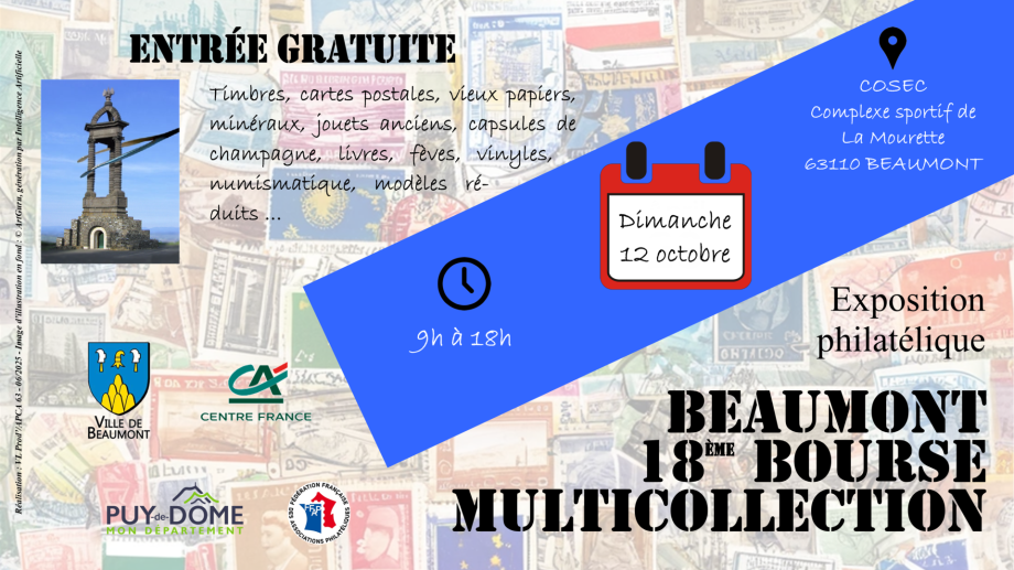 L'Association Philatélique et Cartophile d'Auvergne a le plaisir de vous annoncer sa 18e Bourse Multi-Collections qui se tiendra le dimanche 12 octobre 2025, cette fois au COSEC, Complexe sportif de la Mourette, 63110 Beaumont.